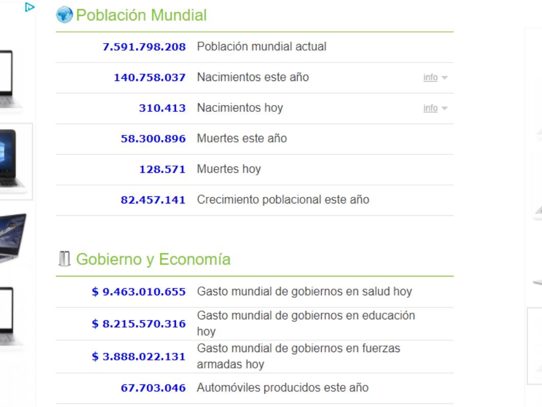 Somos 7.591.822.980 a las 21,56 del 31/12/2017.... Estadisticas del Planeta en tiempo real. Acabando 2017 y dentro de poco comenzando 2018. Población Mundial Gobierno y Economía Sociedad y Medios Medio Ambiente Alimentos Agua Energía Salud ..... Ver en http://www.worldometers.info/es/