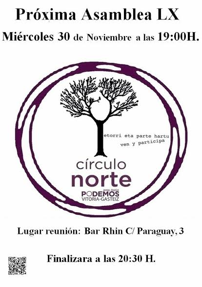 -Miercoles 30 de Noviembre -18:00 Reunión del Círculo Centro C.C. Iparralde (Plaza Zuberoa 1) -19:00 Reunión del Círculo Norte Bar Rhin (Paraguay 3) -19:00 Reunión del Círculo de Podemos por el Socialismo "Pobreza Energética: ¿Cómo combatirla? Sede de Podemos Vitoria... Seguir leyendo →