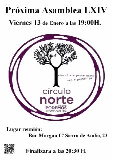 Hola a todxs. Os envío el aviso asamblea 58, OdD, Hoja de ruta del C N y la agenda semanal. Este Jueves en el bar Morgan C/ Sierra de Andia, 23 a las 19:00 h celebraremos la 58 asamblea del C Norte.